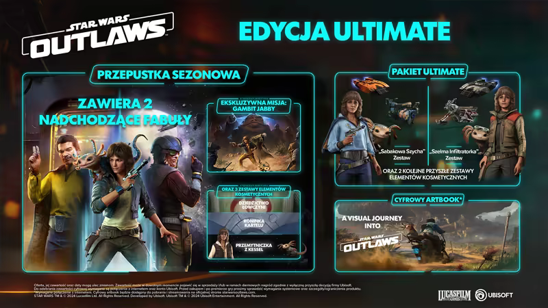 Dzięki wydaniu Star Wars Outlaws Ultimate Edition otrzymasz grę, przepustkę sezonową, pakiet Ultimate, a także cyfrowy artbook.*