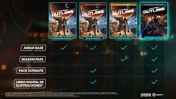 Con la Edición dorada de Star Wars Outlaws conseguirás acceso al juego básico y el pase de temporada, que incluye: