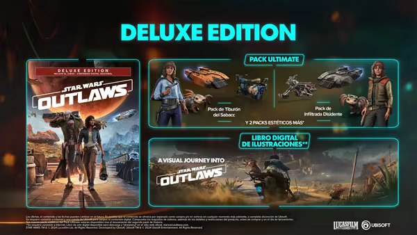 Con la Edición deluxe de Star Wars Outlaws, conseguirás el juego, un libro de arte digital* y el Paquete definitivo, que incluye: