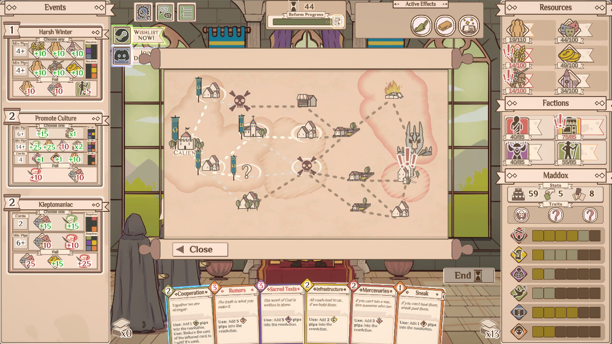 Build a lasting legacy in Royal Decree! Faced with difficult crises, moral dilemmas and unexpected events, you must skillfully craft your deck, balance the resources, rein in the factions, enact powerful decrees, and make tough decisions to protect your crown and indeed your very head!
