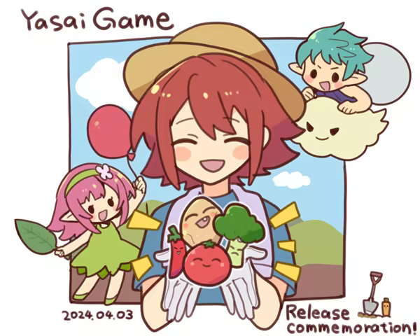"Yasai Game" is a falling object puzzle game that incorporates physics calculations. Players can evolve yasais by dropping different types of yasais into boxes and making them come into contact with each other. A total of 24 types of yasais appear, and the game can be cleared by making the cabbages and pumpkins touch each other.