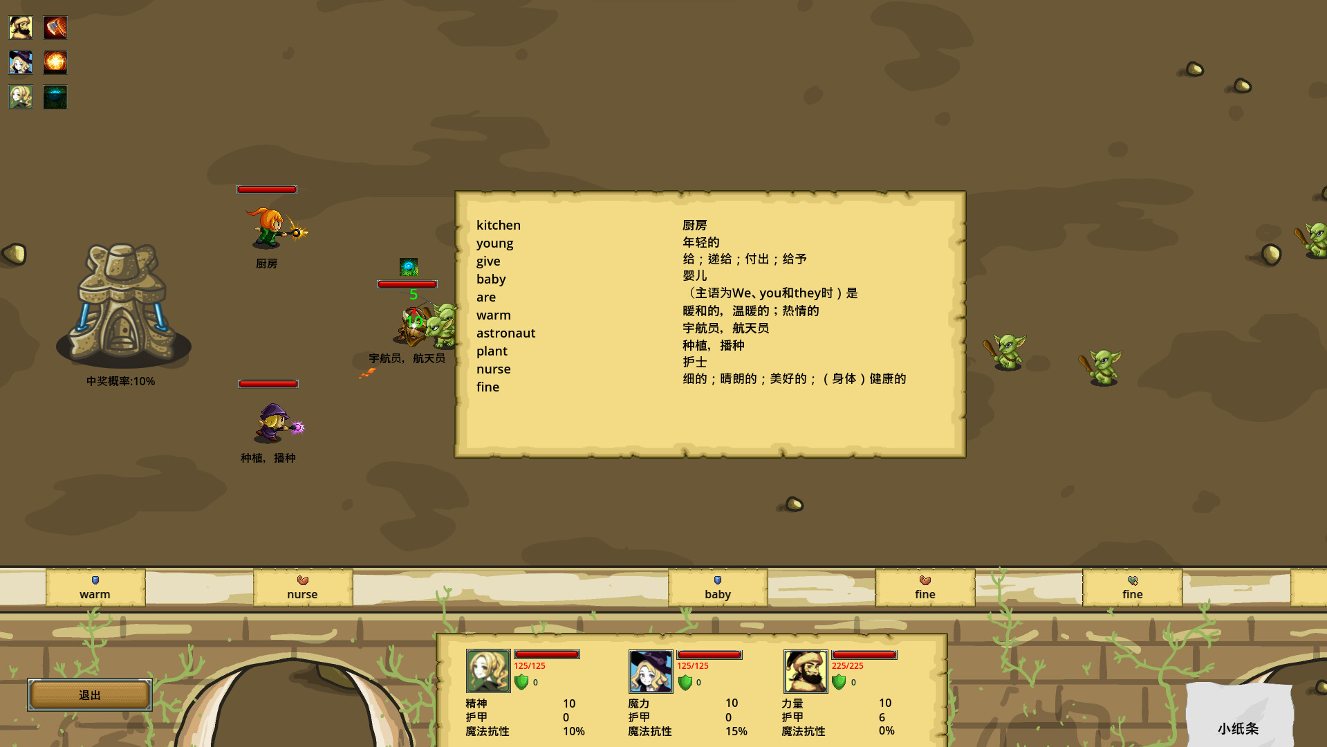 在这款游戏中,您可以利用您所掌握(以及即将掌握)的外文词汇强化您的三个角色。通过拖动单词卡片的方式构筑牢不可摧的坦克,输出,治疗铁三角,在怪物,龙和魔法的世界中抵挡滚滚袭来的强敌,顽强地生存下去吧。