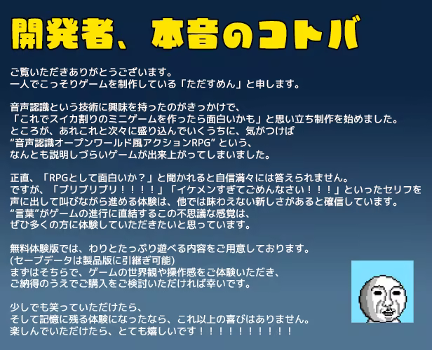 • キーボード(ゲームパッド)で補助操作可能:音声コマンドだけでもエンディングまで到達できる設計にはなっていますが、非常に困難なためおすすめはしておりません。移動など一部の操作については、キーボードで補助できる機能を用意しています。