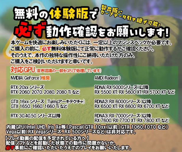 本作はPCの性能(CPU・GPU)により音声認識の精度が左右されます。ご購入の前に、必ず無料体験版で動作をご確認いただき、本作ならではの操作性にご納得いただけた方のみ、ご検討くださいますようお願いいたします。