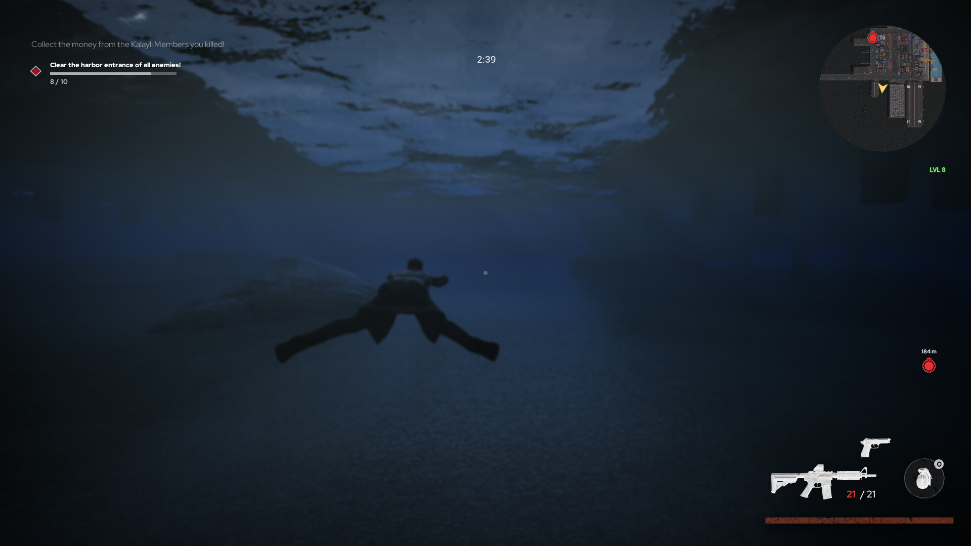 Kill your enemies and collect their money and ammo. Proceed cautiously to clear the harbor area of enemies.