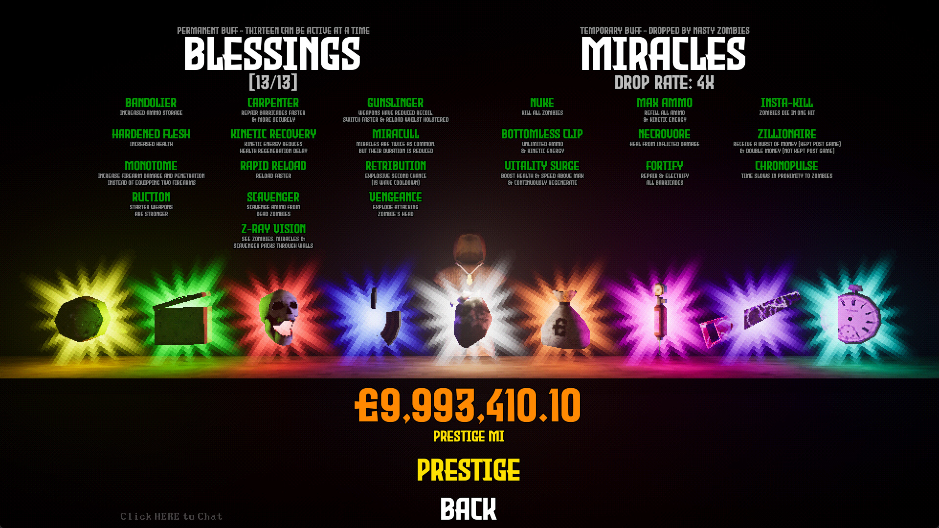 Earn money by killing zombies, then spend it on Blessings and Miracles.