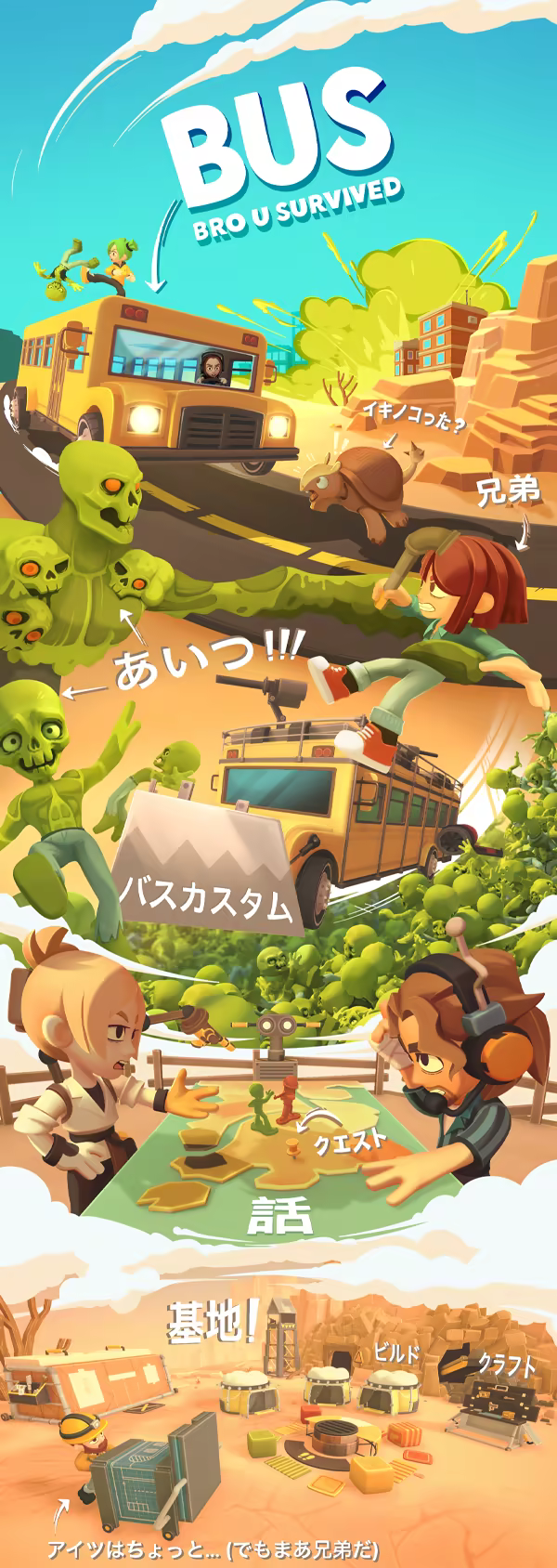 「BUS: Bro U Survived」で狂ったファング島を疾走せよ!最大4人での協力型略奪アクションに仲間を集めろ。ゾンビ黙示録から生存者を救い出し、資源をクラフトして基地を拡張、バスを最凶のビーストマシンへ改造(カスタム)しろ!島の陰謀を暴き、脱出を果たすまで――お前は生き残れるか?