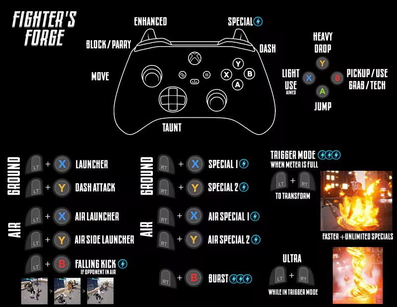 Allowing players to mix-and-match their fighter's avatar, costume, fighting-style, & elemental superpower.