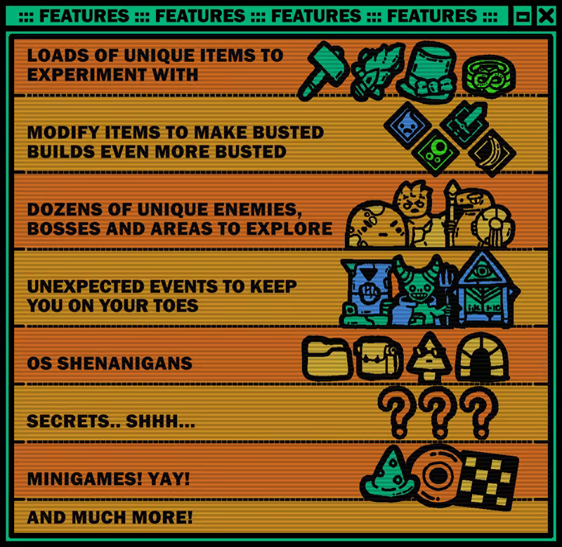 Explore unique zones, discover secrets, adapt to unexpected events and create most broken builds by collecting powerful items and modifying them in this OS-themed roguelike dungeon crawler!
