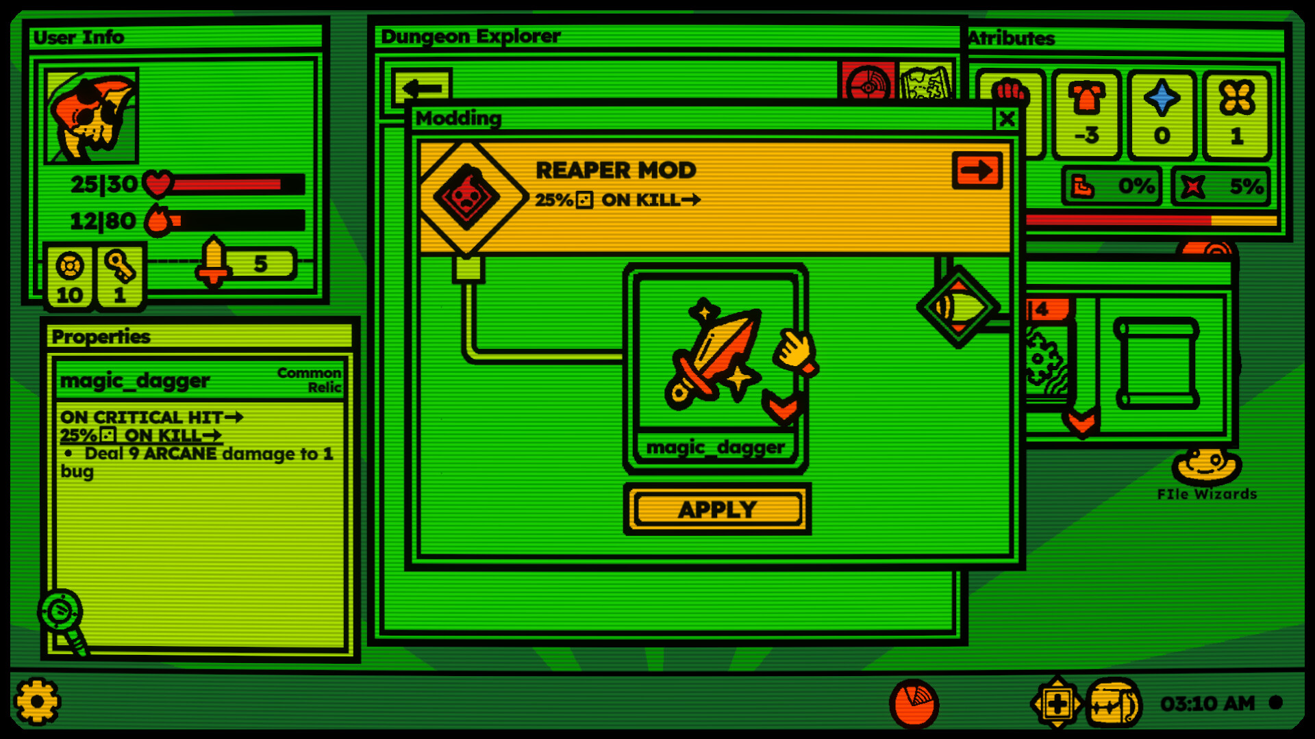 Explore unique zones, discover secrets, adapt to unexpected events and create most broken builds by collecting powerful items and modifying them in this OS-themed roguelike dungeon crawler!