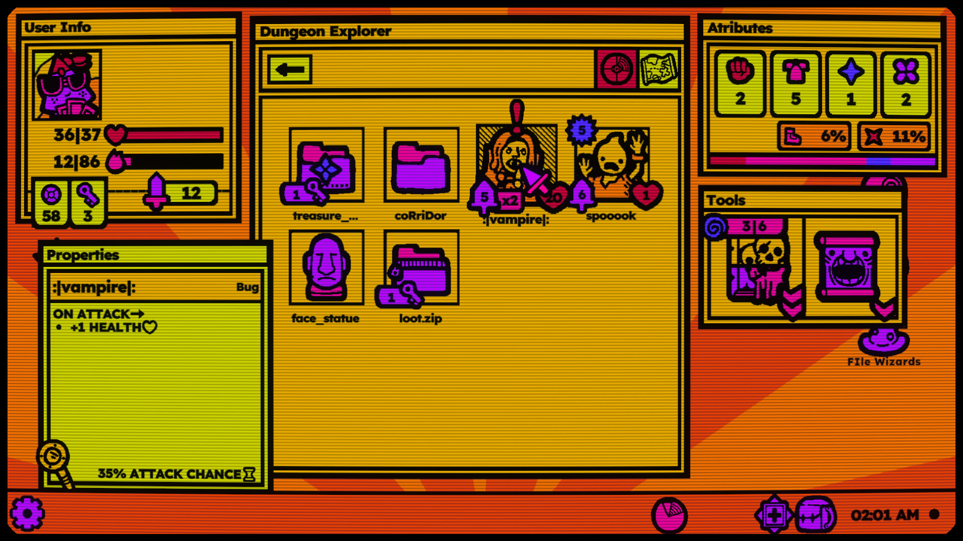 Explore the depths of the folder dungeon by traveling through various ZONES, but keep your eyes peeled because undiscovered SECRET might be just around the corner! Be careful, because every action generates HEAT, so don’t stay in each zone for too long and defeat ZONE BOSS before you OVERHEAT!