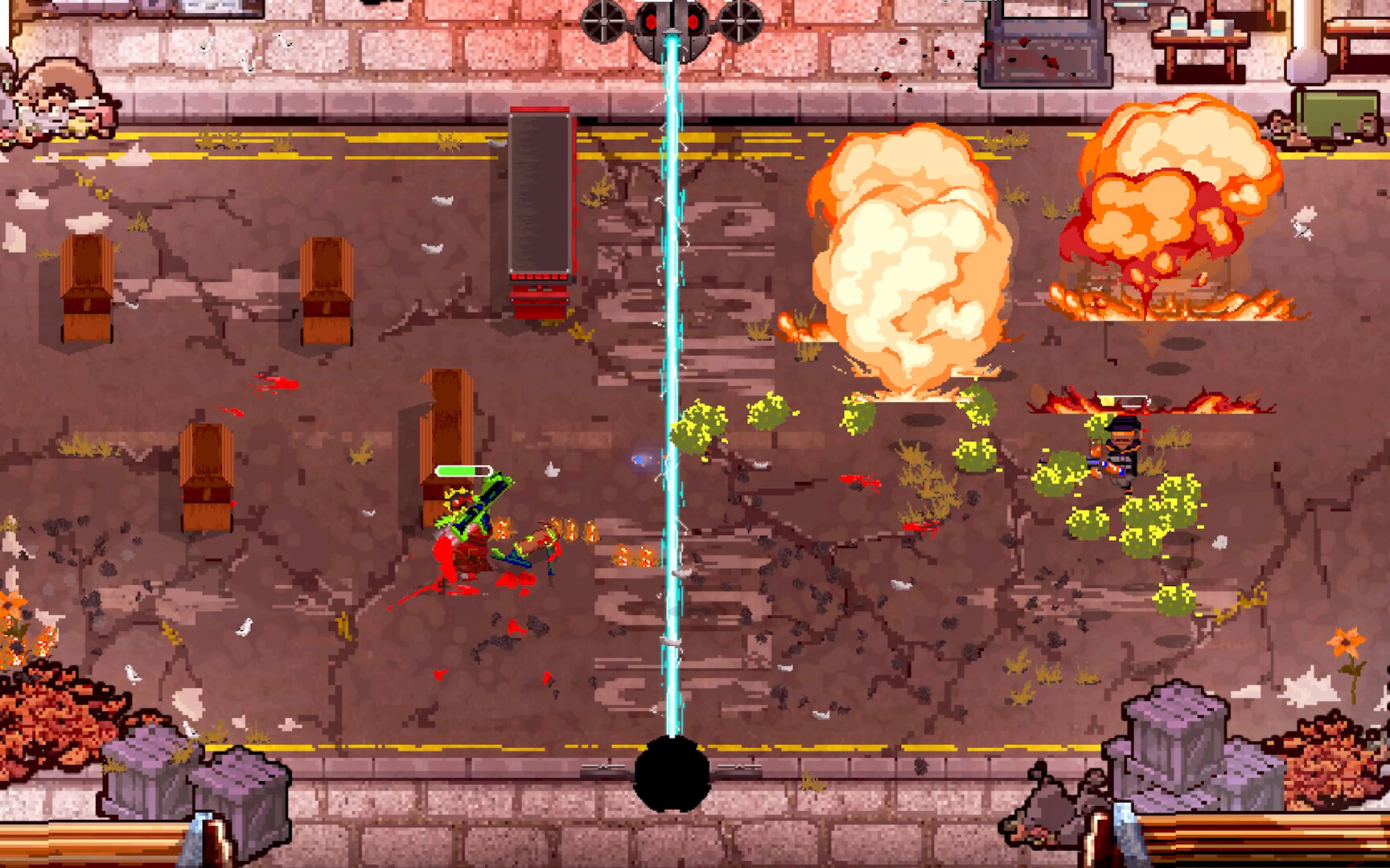 The gameplay has a satisfying crunch to it. The pop of landing a shot. The snap of triggering a super when the moment is right. The dark joy of watching your opponent finished off by a falling wall rather than by anything you did. That last one never gets old. Power-ups fall into the battlefield mid-fight, turning the tide for whoever gets there first.