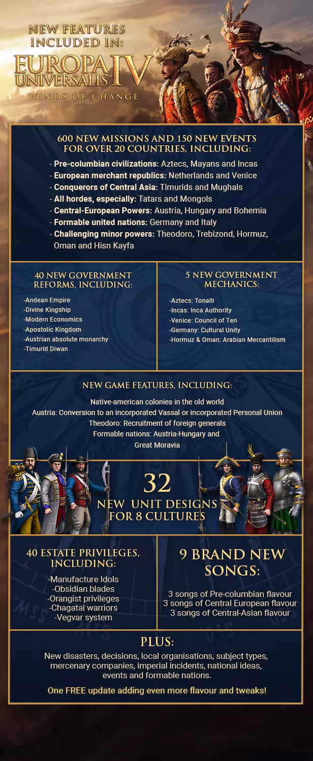 Winds of Change makes wide-ranging changes to twenty nations stretching from the Andean highlands to the vast steppes of Mongolia. There are many new branching missions, government reforms, events, estate privileges and more, including dramatic game-changing options like returning the Timurid Empire to a nomadic society, pursuing the Glorious Revolution to unite the Dutch and English thrones, or leading an indigenous American invasion of Europe.