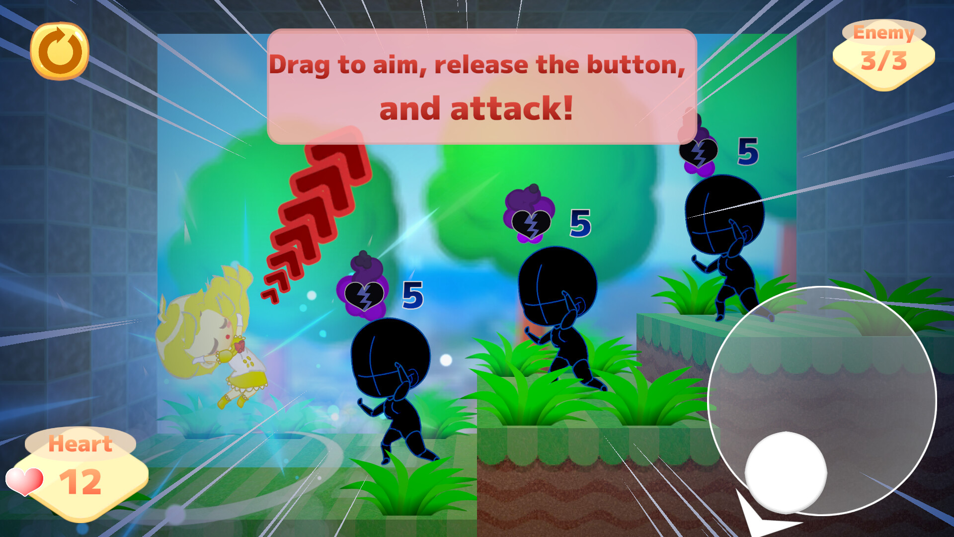 Schoolgirl ”Ryo=Rurube” transforms into battle heroine "Fresh Charge RURU" to combat the evil army "BELF", safeguarding city peace with deadly flying kicks! Grow stronger with skill and items, conquer stages, and defeat huge bosses in this cute yet powerful side-view turn-based action game!