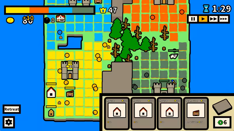 Villagers move on their own, and each round wraps up in just a few minutes. Build various structures, earn money, and grow your population to expand your territory.
