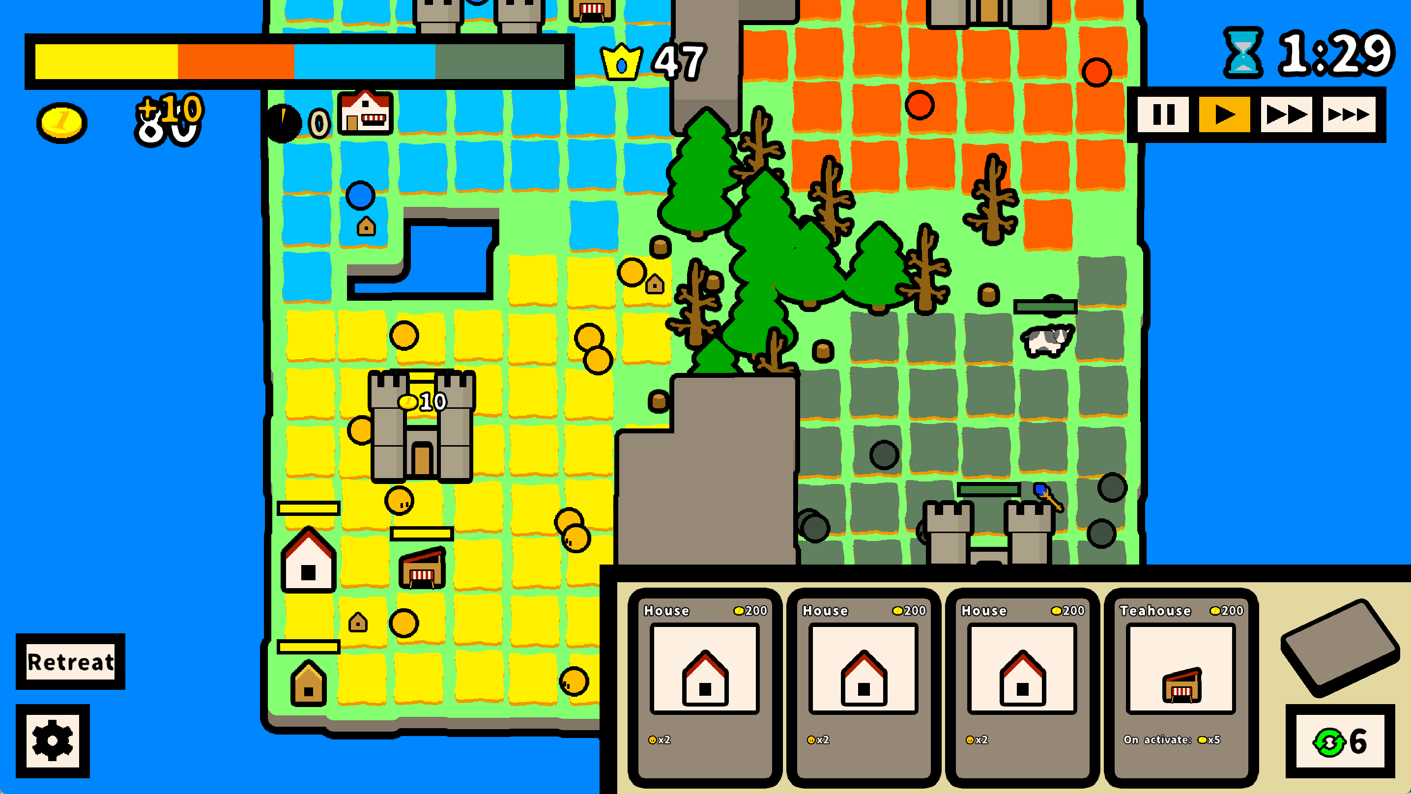 Villagers move on their own, and each round wraps up in just a few minutes. Build various structures, earn money, and grow your population to expand your territory.