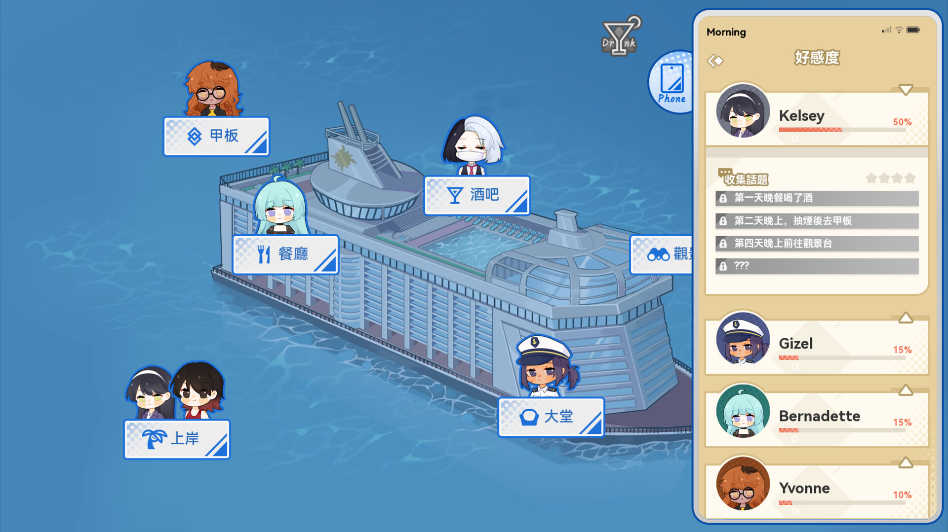 玩家將面臨大量的支線選項,每一個周目的劇情都不會一樣-玩家的選擇將塑造妳在遊輪上的體驗