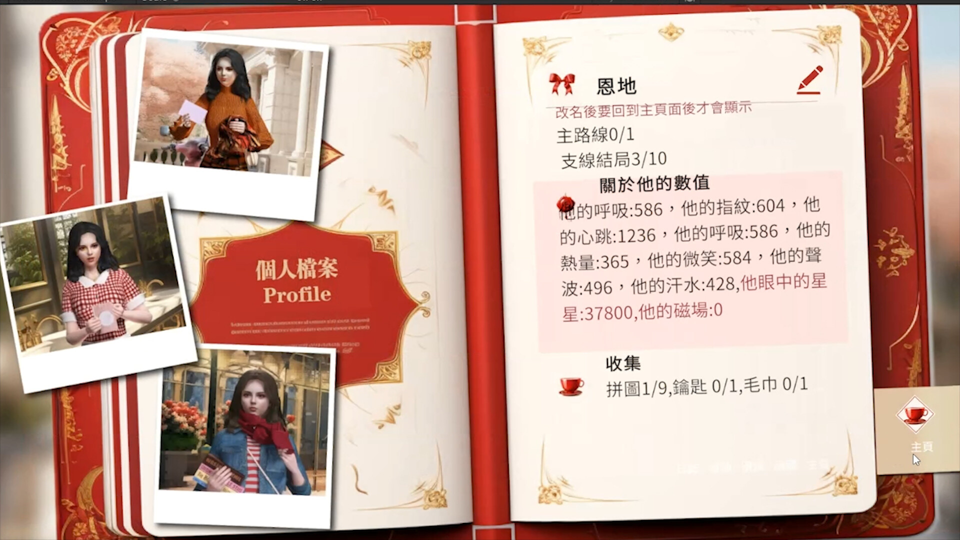 觀看劇情,推進和王子的戀愛。通過收集他的微笑,他的心跳,他的熱量等解鎖王子的不同房間尋找線索解謎
