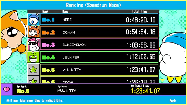 In RANKING, you can compete with users all around the world by total time and challenge to set a new record! In addition to the total time to clear the game, the time to pass check points are also recorded.