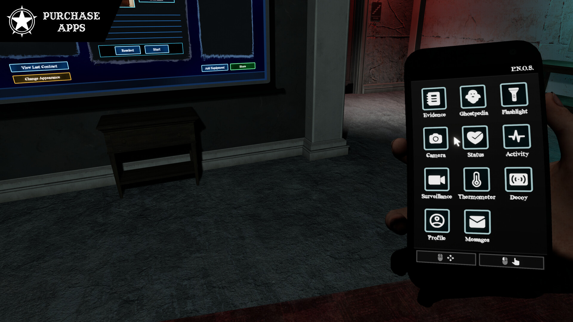 • Upon joining The Unknown, you'll be provided a special phone that allows you to enter evidence, retrieve exorcism steps, monitor temperature, remotely trigger decoys, and more. As you complete contracts, you'll earn experience and unlock maps and ghost types, along with equipment and apps that can be bought from the in-game store with money earned from contracts.