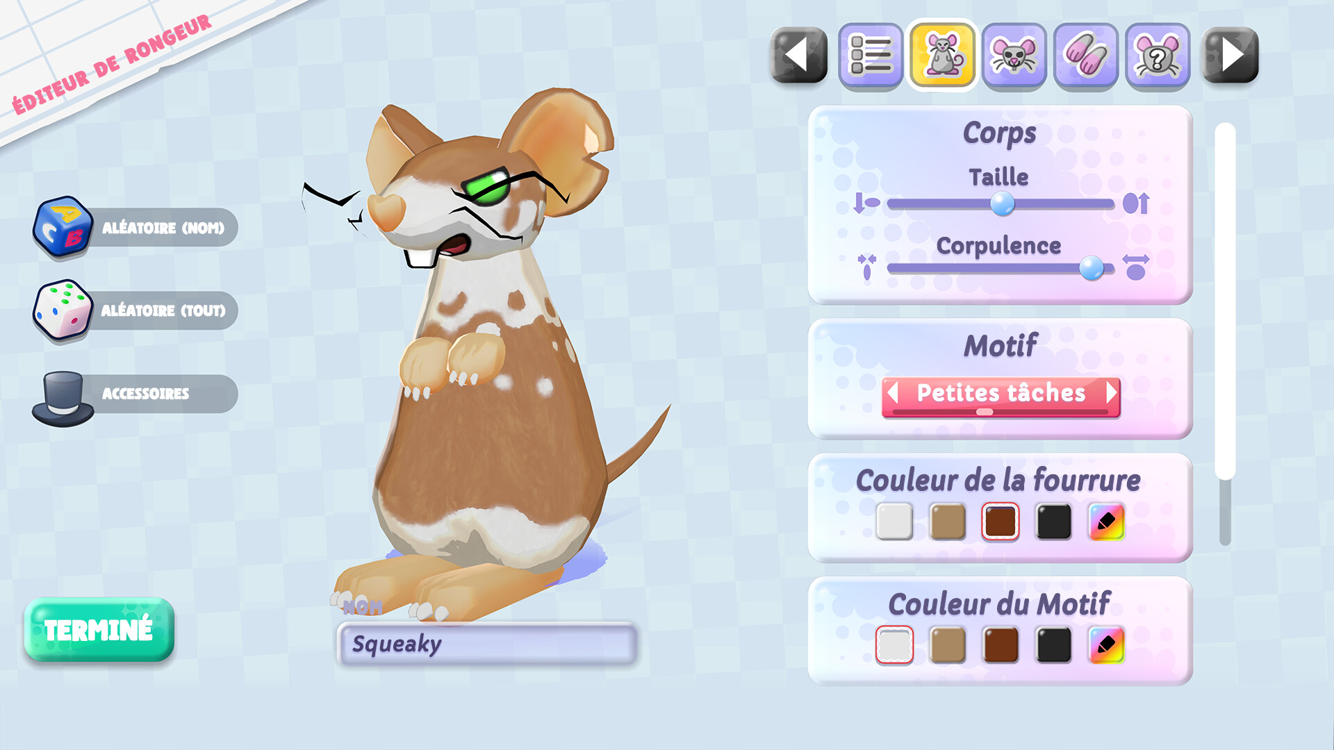 Dans ce jeu conçu par des amoureux de rongeurs pour des amoureux de rongeurs, on a fait en sorte de proposer un large panel d’options de personnalisation pour que tu puisses recréer tes animaux de compagnie dans le jeu.