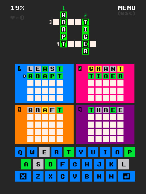 A challenging variant on everyone's favourite word game. Each grid is randomly generated so each playthrough will be unique. The game is easy to learn, but difficult to master. You'll be given a grid of four interconnecting 5 letter words. The aim is to turn the top grid green.