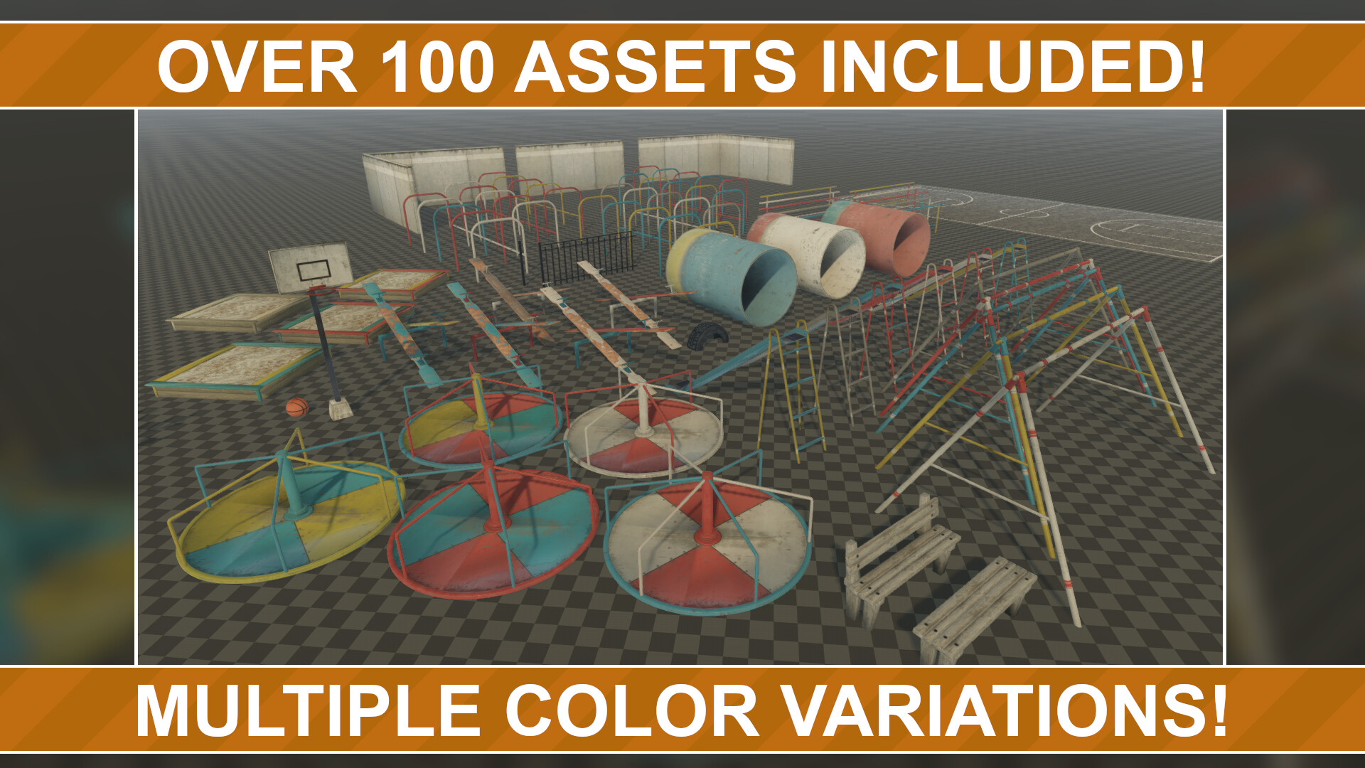 Included in this pack, you'll find assets for playground equipment, including slides, carousels, seesaws, sandpits and even a basketball court- all in various states of decay - from almost new to broken. In addition, you'll find a number of props including fences, benches and multi-purpose surrounds for use around the sandpit, to create defined play areas or even add flower beds.