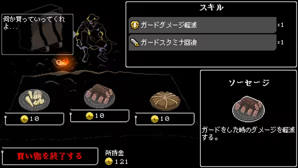 夜になると行商人が登場し、商品を買うことで回復やパワーアップをすることができます。
