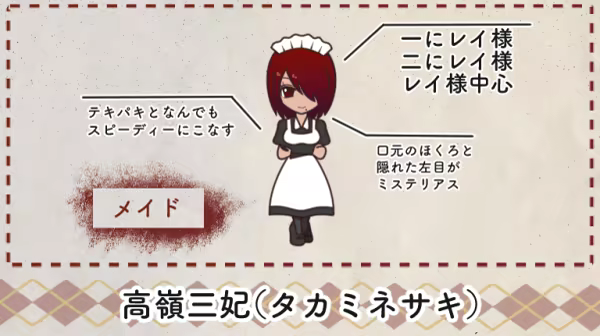 A maid serving the Shirouma family, exclusively for Rei-sama. While she smiles gently, she also takes care of Rei firmly without spoiling him.