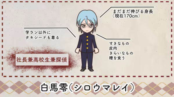 A high school student and also the president of Shirouma Company, managing detective work as well. He harbors a competitive spirit against Chiho.