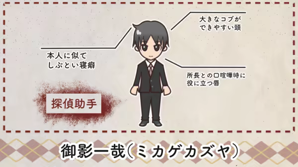 The protagonist of the game. His planned employer goes bankrupt! He heads to the "Utsugi Detective Agency" relying on his grandfather's letter to be hired as an assistant detective.
