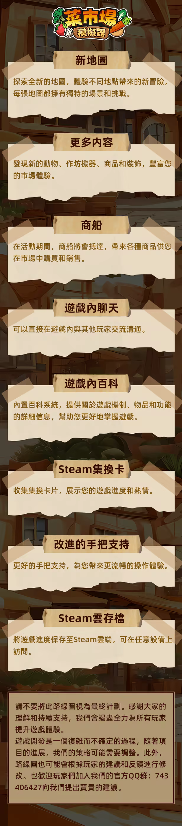 準備好迎接一場熱鬧的菜市場大冒險了嗎?叫上你的小夥伴,一起經營屬￿你們的菜市場小店!別忘了在討論區分享你們的經營心得,或者加入我們的 Discord 頻道,和全球玩家一起吐槽、一起玩!你的每一個建議,都會讓遊戲變得更有趣!