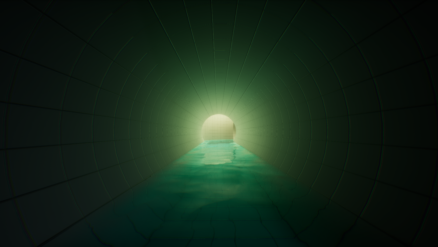 An extensive complex of interconnected rooms and corridors, slightly submerged in undulating, lukewarm water.