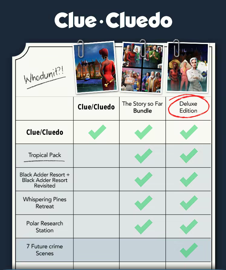 • MORE STORY TO EXPLORE – Discover new backstories, motives and clues in an original Clue/Cluedo tale!