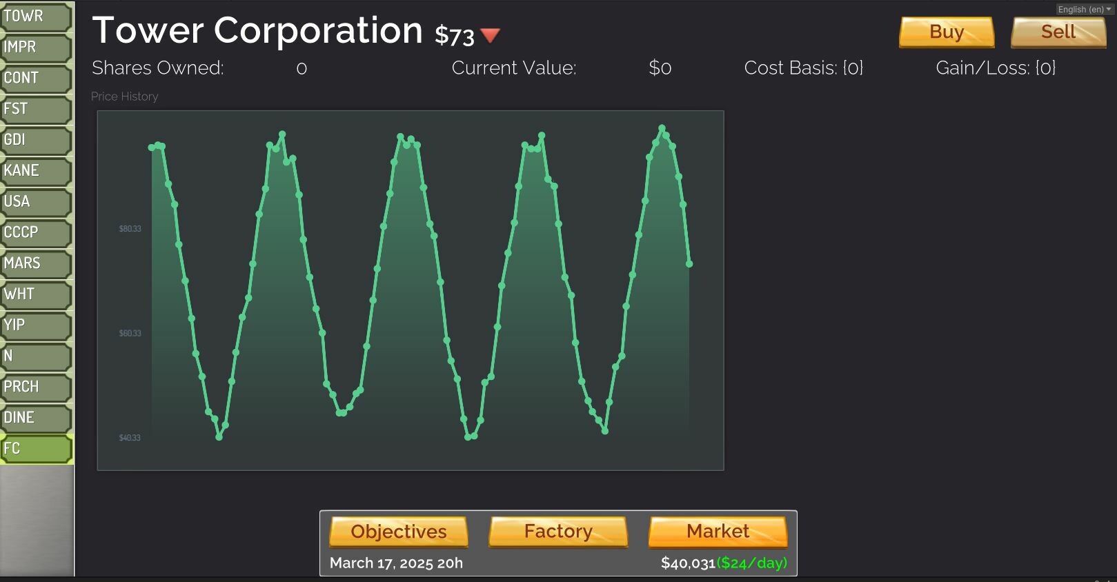 Project overview: Vultures is a desktop single-player game that combines the elements of an economic simulator with those of a manufacturing simulator such as Factorio. The game takes place in real time, with players put in charge of a manufacturing corporate empire. Players are responsible for buying plant and equipment, hiring labor, and buying and selling raw materials and finished goods.