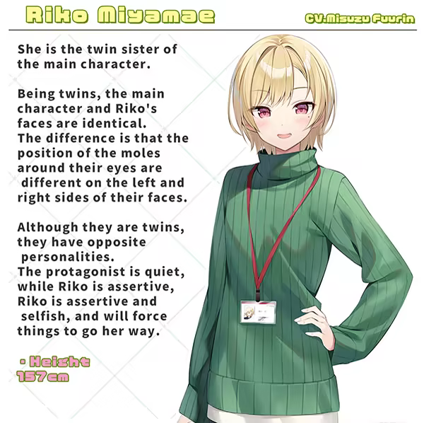 Aoi's twin sister, Riko Miyamae, has a different gender from Aoi, but they are identical in appearance and facial features.