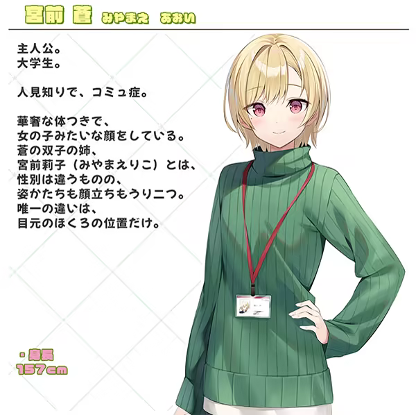 蒼の双子の姉、宮前莉子(みやまえりこ)とは、性別は違うものの、姿かたちも顔立ちもうり二つだった。