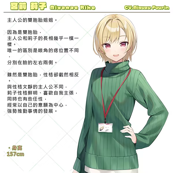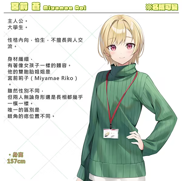 蒼有一個雙胞胎姐姐,宮前莉子。盡管性別不同,但兩人無論是外貌還是長相都幾乎一模一樣。