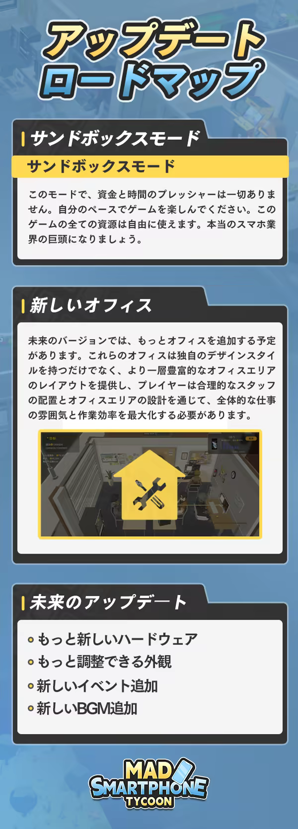 『Mad Smartphone Tycoon』は私個人心を込めて制作した2作目のゲームです。今後も更に精一杯頑張ってゲームをアップデートし続けてと思います。私たちのDiscordチャンネルに加入して、プレイヤーの皆様のご応援とご意見をお聞かせください。どうぞよろしくお願いいたします。