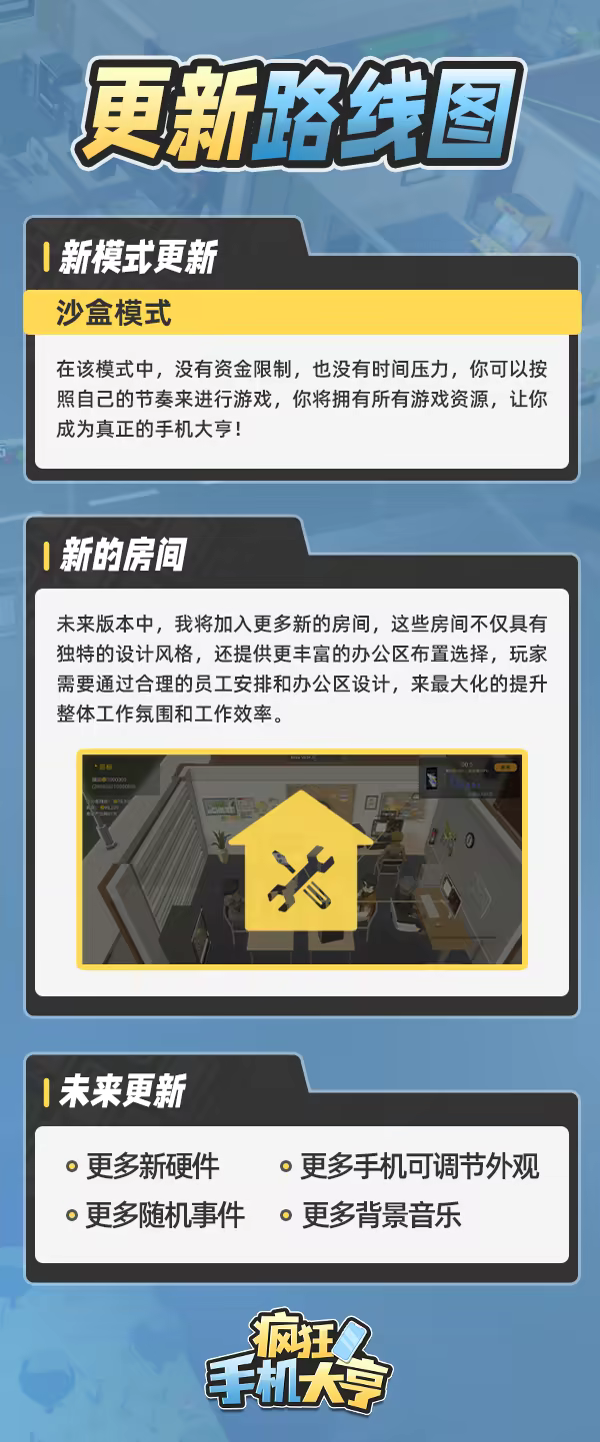 《疯狂手机大亨》是我个人制作精心打磨的第二款游戏。未来,我将更加努力地进行更新,希望能得到玩家们的支持与反馈。请加入我们的交流群QQ:674030665,帮助我改进游戏。