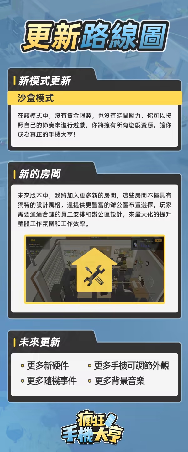 《瘋狂手機大亨》是我個人製作精心打磨的第二款遊戲。未來,我將更加努力地進行更新,希望能得到玩家們的支持與反饋。請加入我們的交流群QQ:674030665,幫助我改進遊戲。