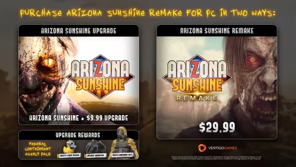 Se già possiedi Arizona Sunshine®, puoi aggiornare la tua versione a Arizona Sunshine® Remake a un costo ridotto. Per farlo, acquista Arizona Sunshine® Remake Upgrade. Devi aver già acquistato in precedenza Arizona Sunshine® su questa piattaforma e averlo installato sul tuo sistema.