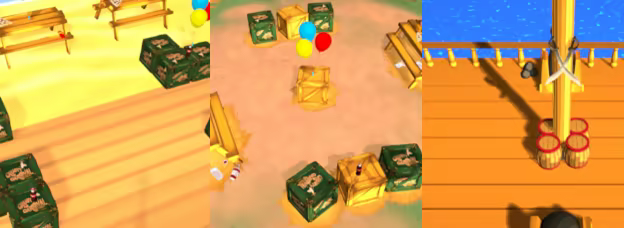 Take your clash to one of three specialized maps, all of which include randomized obstacle placements, each with their own twist! The Crusty Carnival including a roller coaster with drop the Screw Shield powerup, The Beachside Boardwalk with a rising tide concentrates the battle to a small area, and Pirate Peak with crashing waves that sway the boat back and forth.