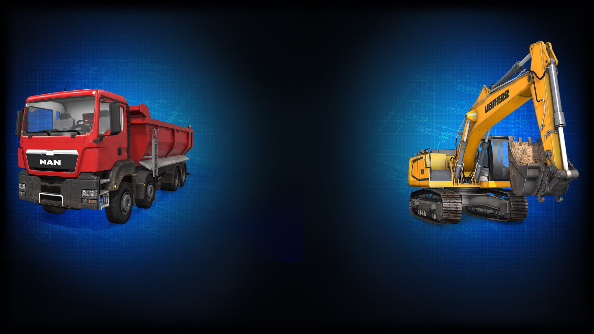 • 16 realistische bouwmachines van LIEBHERR, MAN en STILL