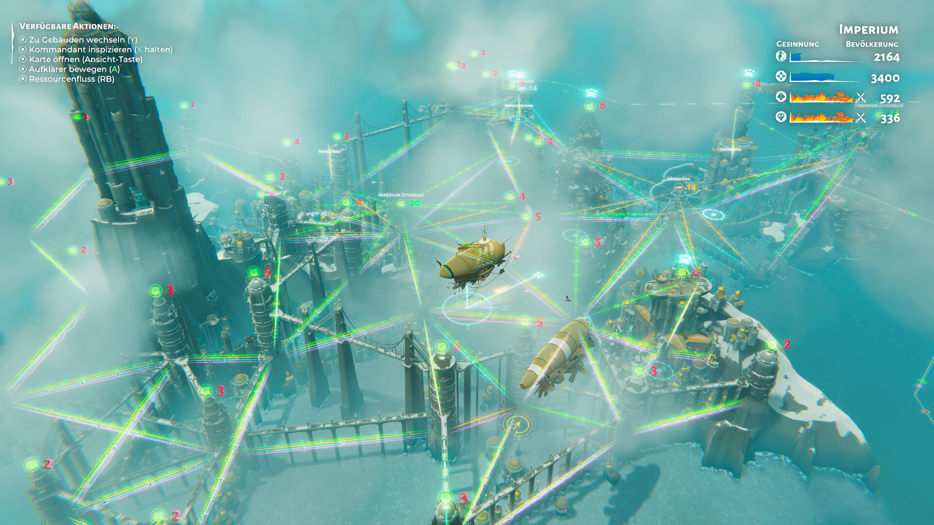 Holz, Stein und Eisen werden nicht gespeichert oder gezählt; das einzige, was zählt, ist die Entfernung, nicht die Kosten. Du transportierst Ressourcen entlang deines Turmnetzwerks sowie über Handelsrouten über das Meer. Türme und Mauern innerhalb der Reichweite der Ressource können kostenlos aufgerüstet und gebaut werden, außerhalb der Reichweite nicht.