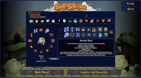 - Selecting all spells from one spellbook unlocks a 'Familiar' effect enabling use of a special ability/extra spells.