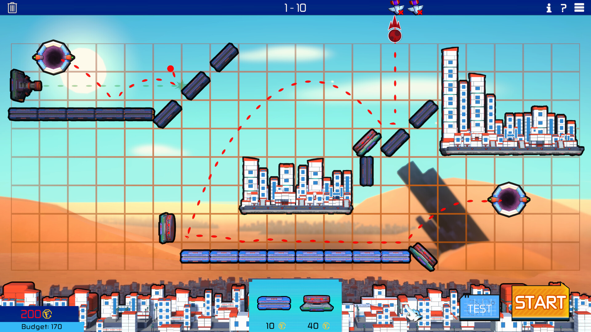 Do you think you can find a more efficient solution? Do not fret. You can iterate between different designs really fast. You can add, destroy, or move your defense buildings endlessly and without cost. And if your head is not on the game at the moment, your solution will be saved, so you can always come back later and tinker with it again.