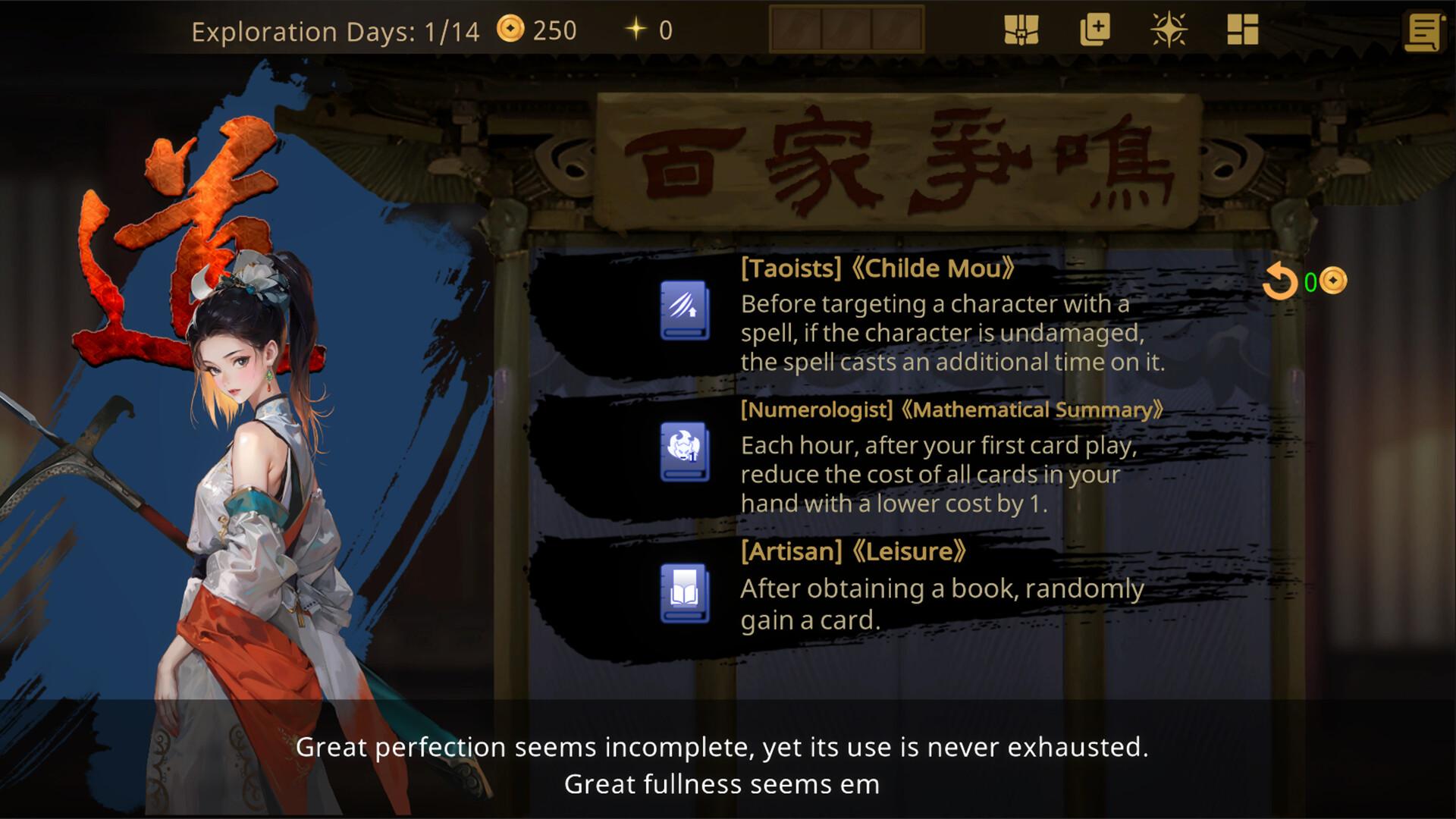 • Books: After a victorious battle, players have the chance to acquire books of various philosophical types, which confer bonuses or introduce new combat mechanics for the entire team.