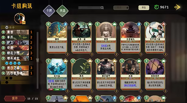 在游戏中卡组由英雄和卡牌构成,玩家将在游戏的过程中收集各式各样的卡牌,解锁各种能力各异的英雄。在游戏开始前玩家可以完全自由的自定义自己的卡组,在游戏前进的过程中玩家还会额外获得卡牌,这意味着玩家还可以继续收集卡牌加强牌组,在下一场战斗前根据自己的阵容和手上的卡牌资源构筑出打击敌人的最佳卡组。