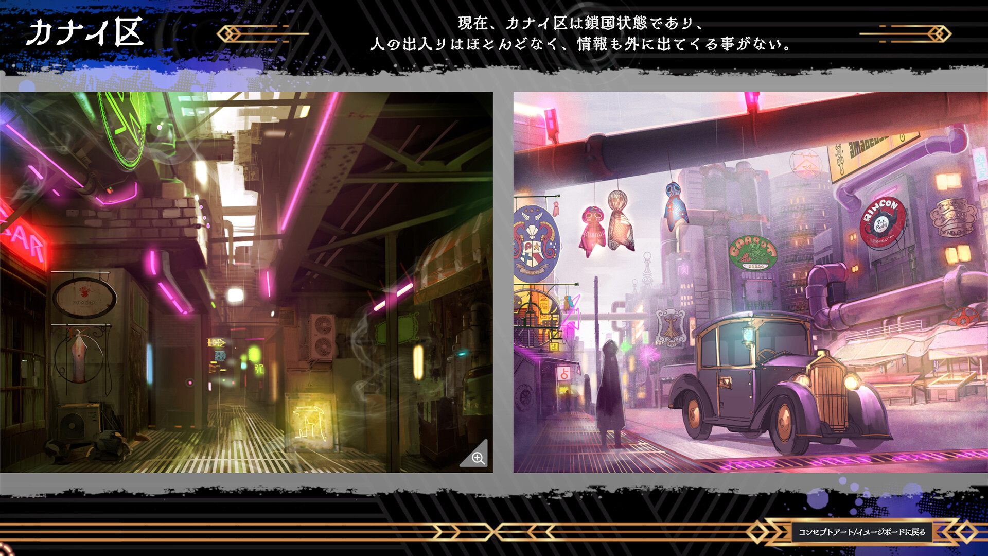 キャラクターの詳細なビジュアル、「カナイ区」や「謎迷宮」のコンセプトアートなどを収録。